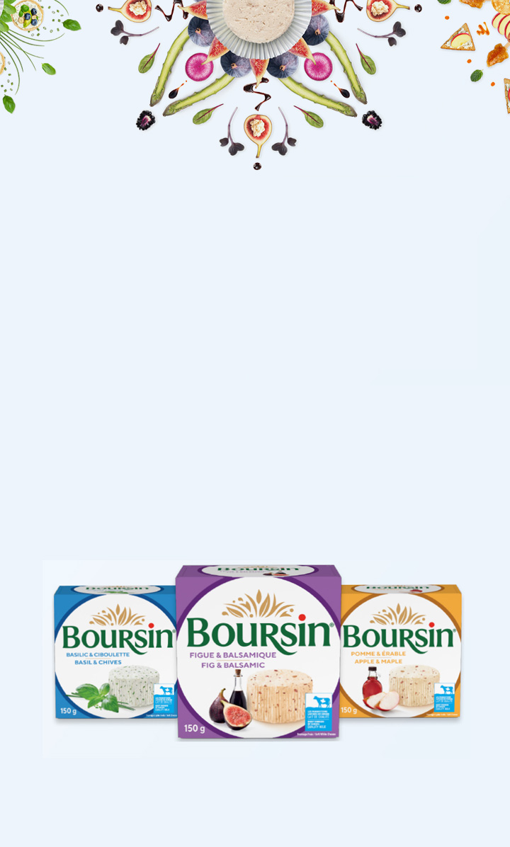 Jetez un œil à notre carte et découvrez nos recettes originales qui mettent à l’honneur toutes les saveurs Boursin. Simples et savoureuses, elles régaleront l’assemblée en toutes occasions : en plat, en collation ou en bouchées pour un apéro chic. Laissez-vous tenter ! Ces créations inspirées de notre fameux fromage deviendront à coup sûr vos spécialités.